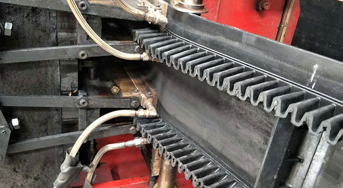 擋邊和隔板的底部和基帶熱硫化成一體,擋邊和隔板的高度可以達到40-630mm,在擋邊中加貼帆布以加強擋邊抗撕裂強度,波狀擋邊帶柔順靈活,能保證輸送帶平穩的通過端輪和尾輪。