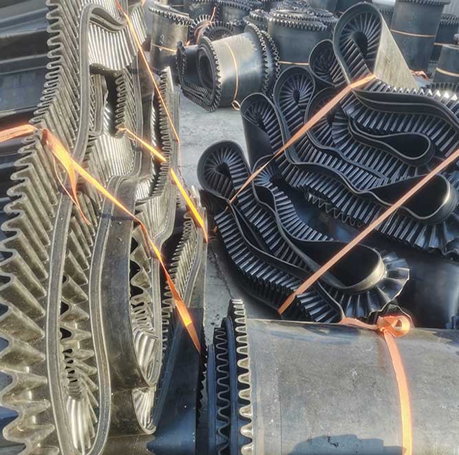 大傾角波狀擋邊帶:擋邊起防止物料測滑撒落的作用。為便于繞過滾筒,檔邊設計成波紋狀;橫隔板的作用是承托物料,為了實現大傾角輸送,采用T型TC型。檔邊和橫隔板是用二次硫化的方法與基帶連接的,具有很高的連接強度